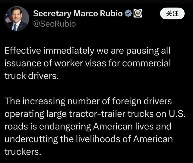 美国国务卿鲁比奥21日在社交媒体上宣布,美国将停止发放商用卡车司机工作签证。